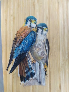 Deze plank is met de hand getekend met kleurpotloden direct op bamboe en afgelakt.
